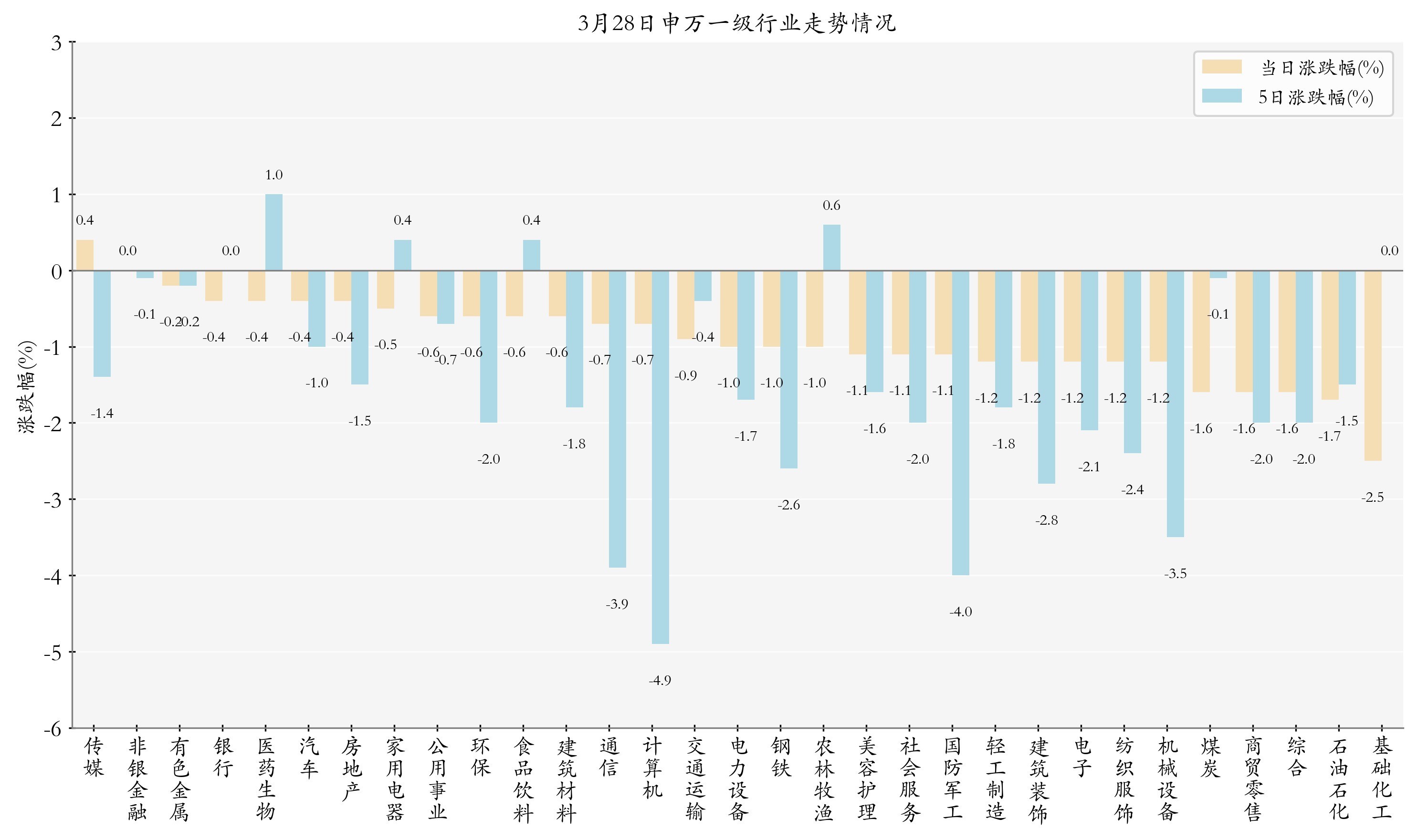 统计今日全部申万一级行业涨跌幅情况,传媒、非银金融与有色金属今日走势排名靠前,日涨跌幅分别为0.45%、-0.01%与-0.17%,基础化工、石油石化与综合的走势排名靠后,日涨跌幅分别是-2.48%、-1.71%与-1.6%;近5个交易日医药生物、农林牧渔与食品饮料的走势排名靠前,近5日涨跌幅分别为0.98%、0.56%与0.4%,计算机、国防军工与通信的走势排名靠后,近5日涨跌幅分别为-4.89%、-3.98%与-3.87%。