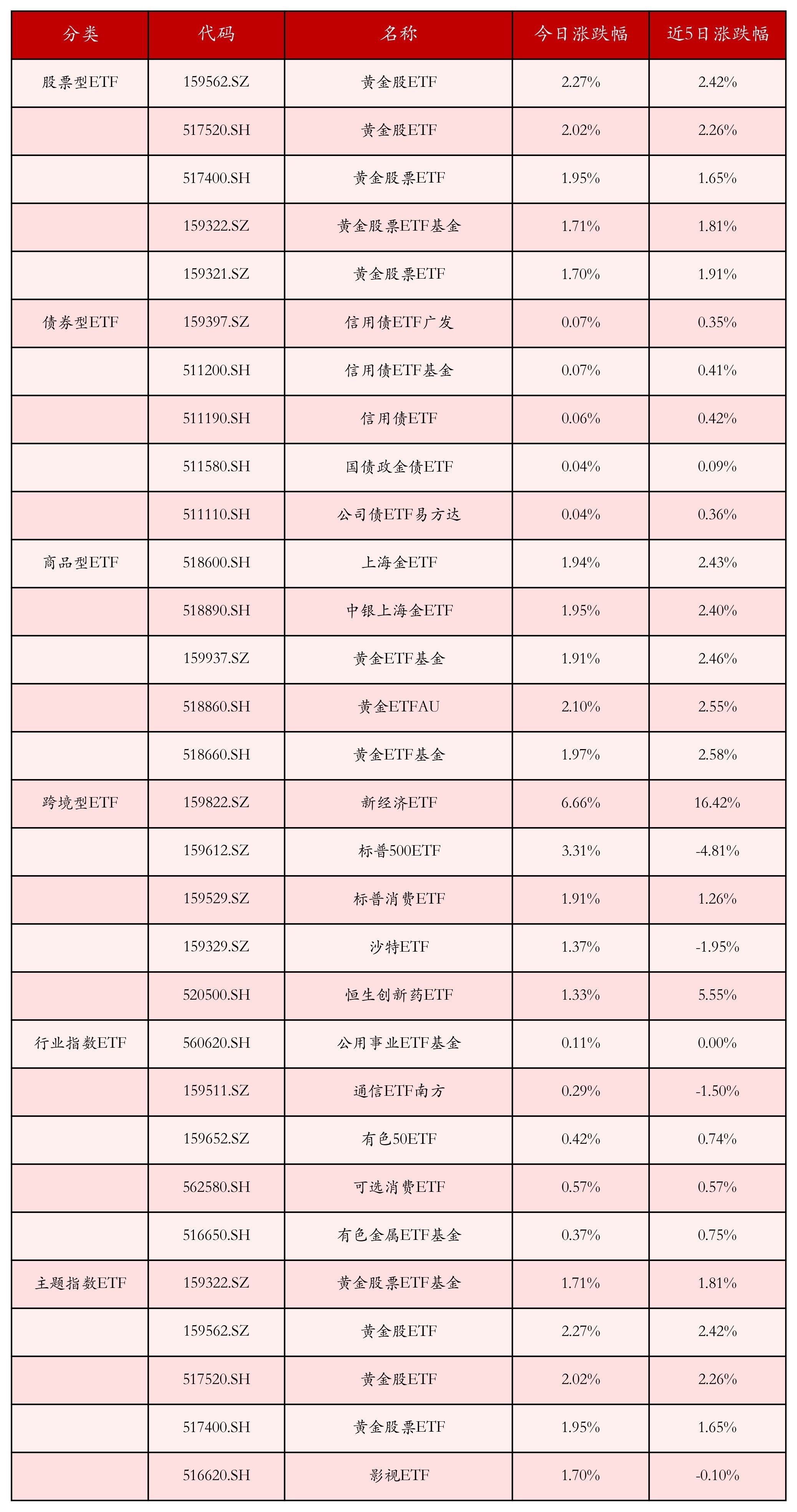 从不同投资种类、行业、主题的ETF产品中找出今日走势行情排名前5的ETF基金,今日涨幅靠前的ETF产品如下表所示。股票型ETF中涨跌幅排名前3位的ETF产品分别为黄金股ETF(159562.SZ)、黄金股ETF(517520.SH)和黄金股票ETF(517400.SH),今日收益率分别为2.27%、2.02%和1.95%。